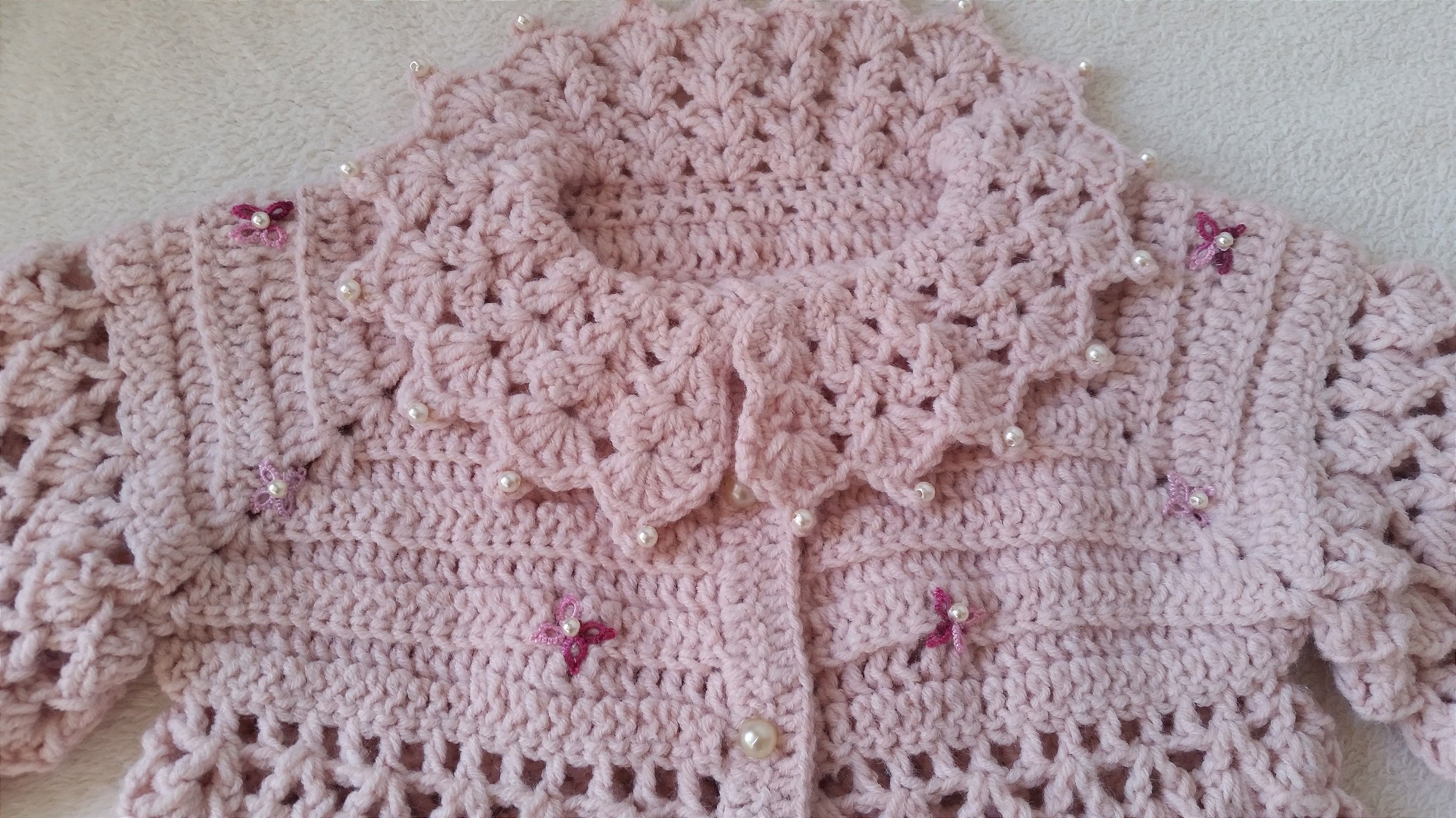 Casaco para bebê feito em crochê com lã antialérgica.