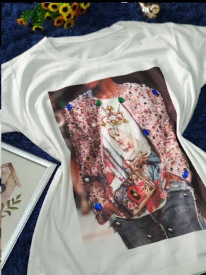 Produto : T-shirt (camiseta brancas com sublimação e pedrarias.)